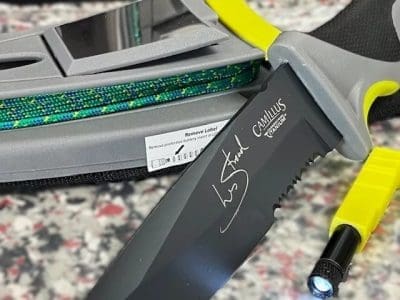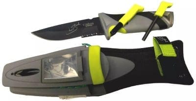 Les Stroud has survived the harshest and most remote climates on Earth without food, water or a support team. His innovative survival knowledge and unparalleled skills have proven Les to be the true Survivorman. The Less Stroud Signature Series combines the essence of survival and innovative thinking with Camillus’s best materials and craftsmanship. The result is a true survival knife line. Les Stroud Signature Knives are incomparably tough and built to withstand the impossible task of your next challenge. This Camillus Les Stroud SK Mountain Ultimate Survival Knife is 10-Inch overall. 4 3/4-Inch carbonitride titanium bonded 440 stainless non-stick partially serrated drop point blade. Full tang. Black and grey textured TPR handles with yellow finger notch. Knurled steel pommel with lanyard hole. Hard ballistic nylon sheath with integrated ceramic v sharpener, paracord wrap, integrated LED flashlight and whistle, fire starter, S.O.S. signal mirror, trail map mesh pocket and storage compartment.