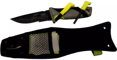 Includes integrated ceramic sharpener, para-cord wrap, integrated LED flashlight (Flashlight batteries may need to be replaced) and whistle, fire starter, S.O.S. signal mirror, storage compartment, trail map mesh pocket