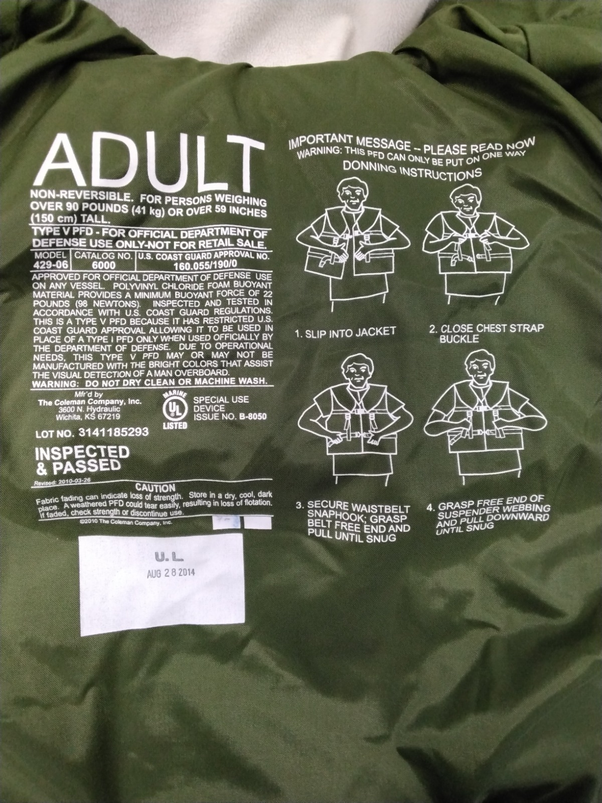 Non-reversible vest-style Type 1 personal Floatation Device (PFD) designed for comfort and performance. Aquafoam floatation foam provides a minimum of 22LB of buoyancy.