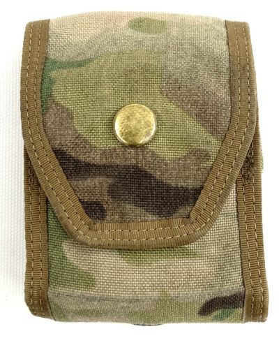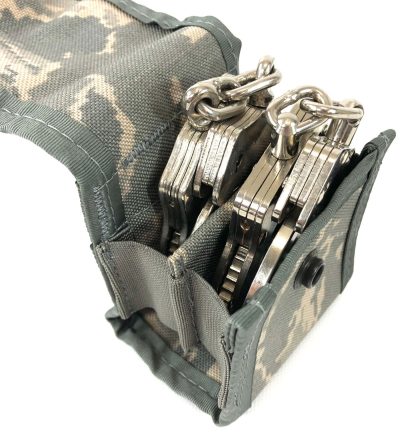 This is a double handcuff pouch that was used in by the US Air Force (USAF). The pouch holds two sets of handcuffs securely with a button snap flap. The divider keeps the handcuffs separated. Also, you can mount this pouch to any MOLLE compatible surface.